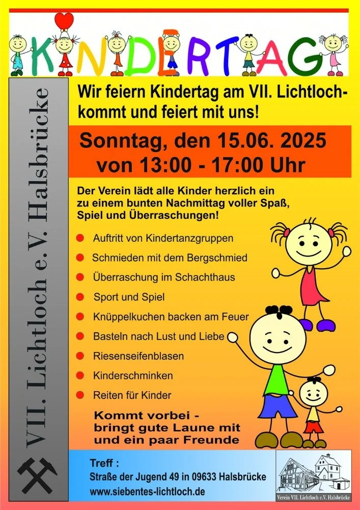 Zurück zu allen Events Kindertag Sonntag, 15. Juni 2025 13:00 17:00 Google Kalender ICS Wir möchten gern wieder mit euch den „Kindertag“ an den Anlagen am VII. Lichtloch feiern. Deswegen sind alle Kinder ganz herzlich eingeladen, mit Freunden und Familie sowie mit guter Laune diesen Nachmittag bei uns zu verbringen.